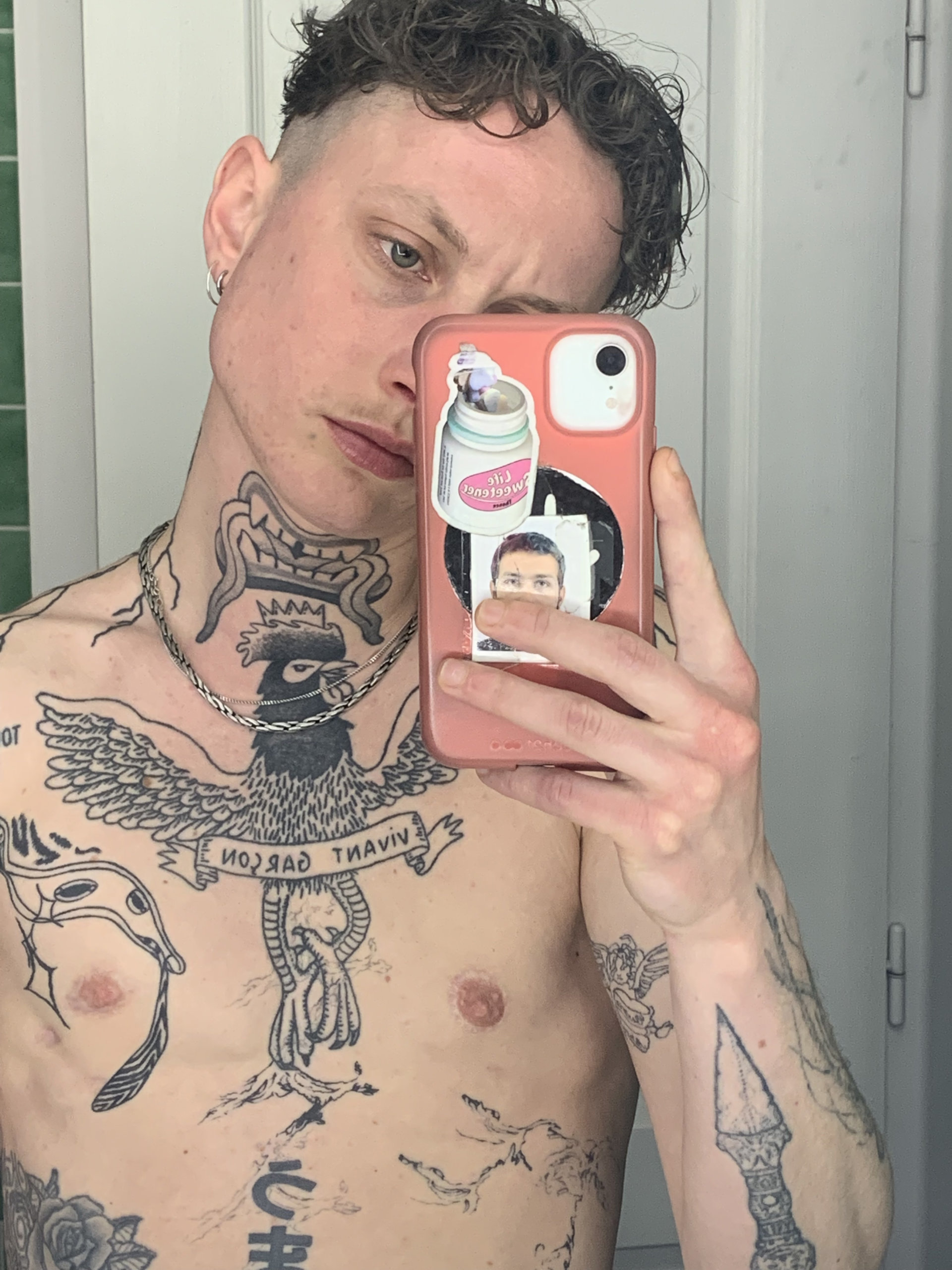 Je suis une jeune personne trans non-binaire de 26 ans, très androgyne, étudiante en art. J'ai fait ma torsoplastie il y a un an, j'ai le haut du corps fin et musclé.